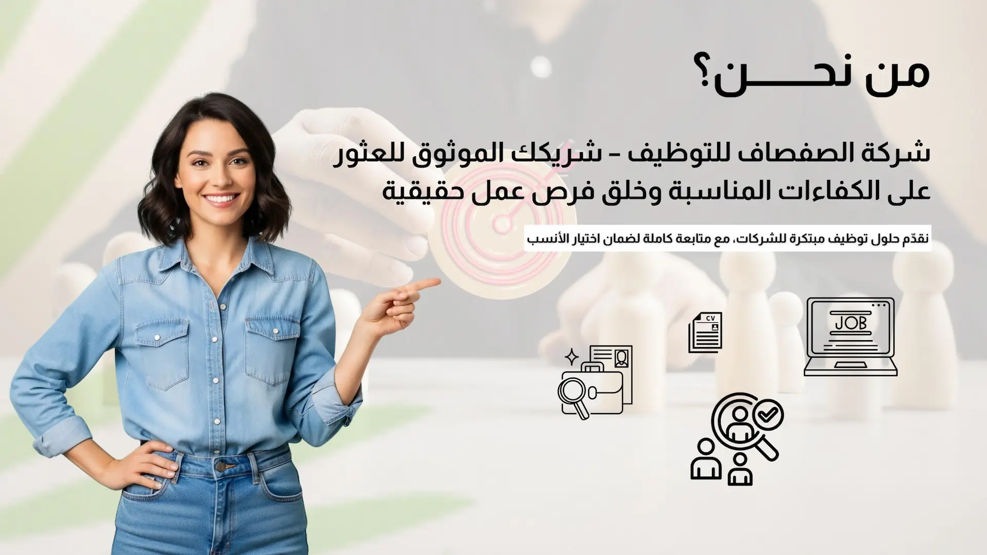 شركة الصفصاف للتوظيف شركه الصفصاف للتوظيف شركه الصفصاف للتوظيف شركه الصفصاف للتوظيف أثرنا عندما تختار الأشخاص المناسبين سنوات الخبرة + 0 0 % العمليات في السوق السعودي الشركات المتعاونة + 0 يبدأ مستقبلك بالتغيّر الأسواق الإقليمية 0 +K 0 عدد المرشحين المُعيّنين نسبة رضا العملاء 0 % لأكثر من 25 عامًا، تعمل شركة الصفصاف على استقطاب الكفاءات المؤهلة. نحن شريككم الموثوق لفرص العمل في الأسواق الأردنية والخليجية والعربية. ماذا نفعل خدمات للأفراد والباحثين عن العمل ربط الباحثين عن العمل بالفرص مطابقة دقيقة بين المهارات وفرص العمل المناسبة في الأسواق المحلية والخليجية. تحسين السيرة الذاتية والتحضير للمقابلات تطوير احترافي للسيرة الذاتية وتدريب على مهارات المقابلات الوظيفية. الاختبارات المهنية الدولية تنظيم وحجز اختبارات PROMETRIC وPEARSON VUE بالتعاون مع الجهات المعتمدة. استشارات مهنية توجيه مهني لمساعدتك في تحديد المسار الوظيفي الأنسب بناءً على المهارات والخبرة. تنظيم العقود والإجراءات الرسمية متابعة توقيع العقود واستكمال جميع عمليات السفر والتوظيف. التصديقات والشهادات إدارة إجراءات التأشيرات والتصديقات والتحقق من المستندات بالتنسيق مع الجهات الرسمية. ماذا نفعل خدمات الشركات اكتساب المواهب اقتراح مرشحين تتوافق مؤهلاتهم وخبراتهم بدقة مع متطلبات الوظائف والوصف الوظيفي. التوظيف التنفيذي توفير محترفين على مستوى الإدارة العليا وذوي الخبرة العالية بسرعة ودقة. إدارة عمليات التوظيف إدارة شاملة لعملية التوظيف — من استقبال طلبات الوظائف حتى توقيع العقود النهائية. التأشيرات والتصديقات إدارة إجراءات التأشيرات وتصديقات المستندات بالتنسيق مع الجهات والسفارات المعنية. استشارات الموارد البشرية تقديم حلول وخدمات استشارية لدعم استراتيجيات التوظيف وتطوير قدرات القوى العاملة. معًا نحو النجاح شركاء النجاح